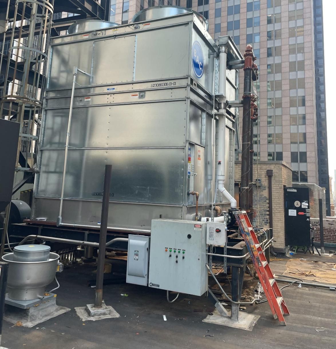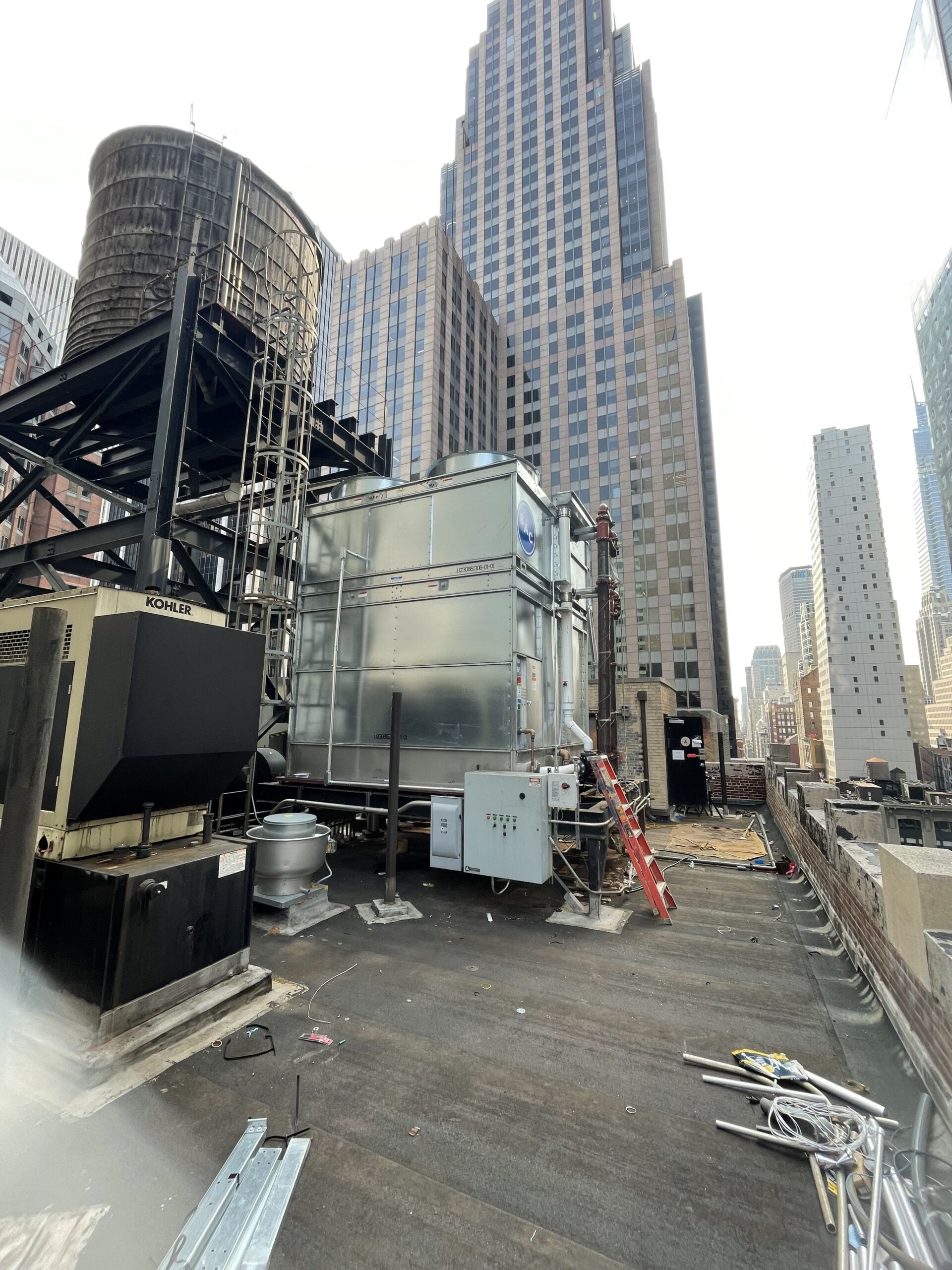 At 125 West 45th Street, our team completed a 2023 rig-in-place replacement of a closed-loop cooling tower serving the building’s mechanical systems. The project scope included replacement of condenser water supply (CWS) and return (CWR) piping and reconnection of the existing variable frequency drive (VFD). This project demonstrates our expertise in specialized cooling tower applications and precise mechanical execution in high-density urban settings.